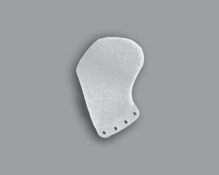 The 3D Orbital Floor is an off-the-shelf anatomic design based on CT data for medium to large orbital floor fractures. The structure is comprised of porous bone side to prevent migration and a nonporous layer that are heat bonded together to provide support while extending over the orbital rim for a smooth transition to bone. The eyelets accommodate 1.3mm self- drilling screws. When contouring, the implant bends and holds the desired shape without the heating.
